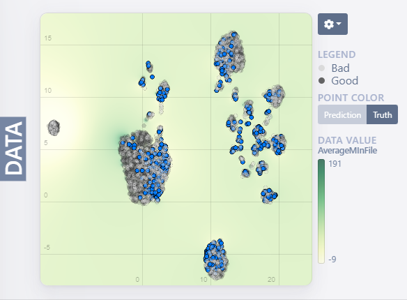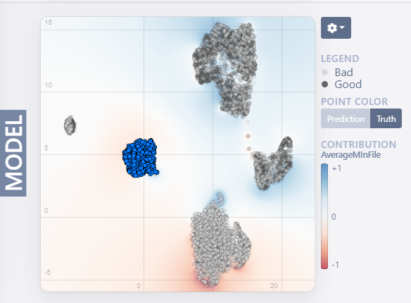 This is a screenshot of the Xaiva Analyze component of our platform. You can see the model distribution - constructed from feature importance values - is a lot cleaner, with more prominent clusters and less lonely specks of instances. We selected a clear group - a model strategy - within the model distribution, this same selection is reflected in the data distribution. This clearly shows the model strategy varies wildly from any data cluster we can define based on data features.
